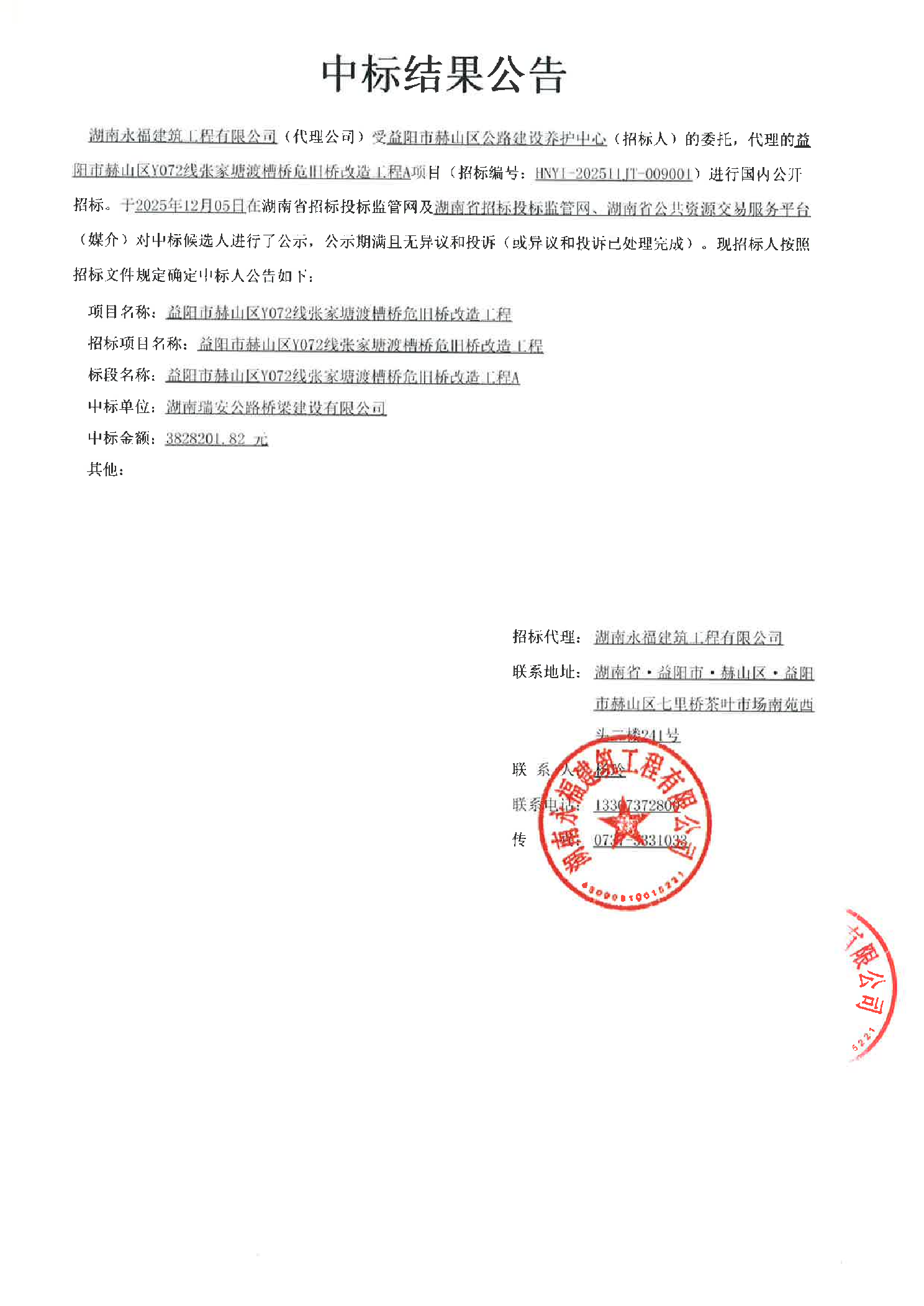 益阳市赫山区Y072线张家塘渡槽桥危旧桥改造工程中标结果公示